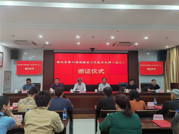 5月23日,德化县举行第六届省工艺美术大师(名人)颁证仪式,为德化县获评第六届福建省工艺美术大师和第六届福建省工艺美术名人的人员颁发证书。德化县副县长郑荣尊,我会执行副会长吴俊民、雇主部主任谢锦阳,泉州市城联社科长林志伟,德化县城联社主任曾建清,德化县企联秘书长蒋承设等领导出席颁证仪式。